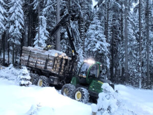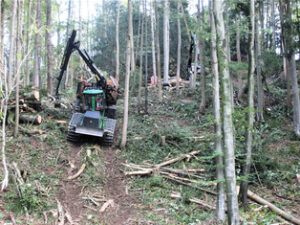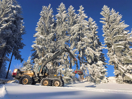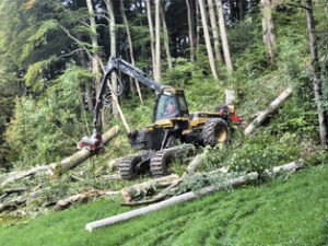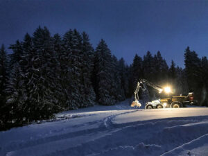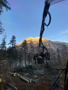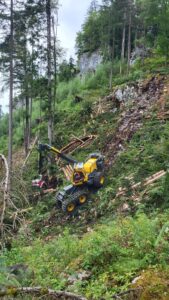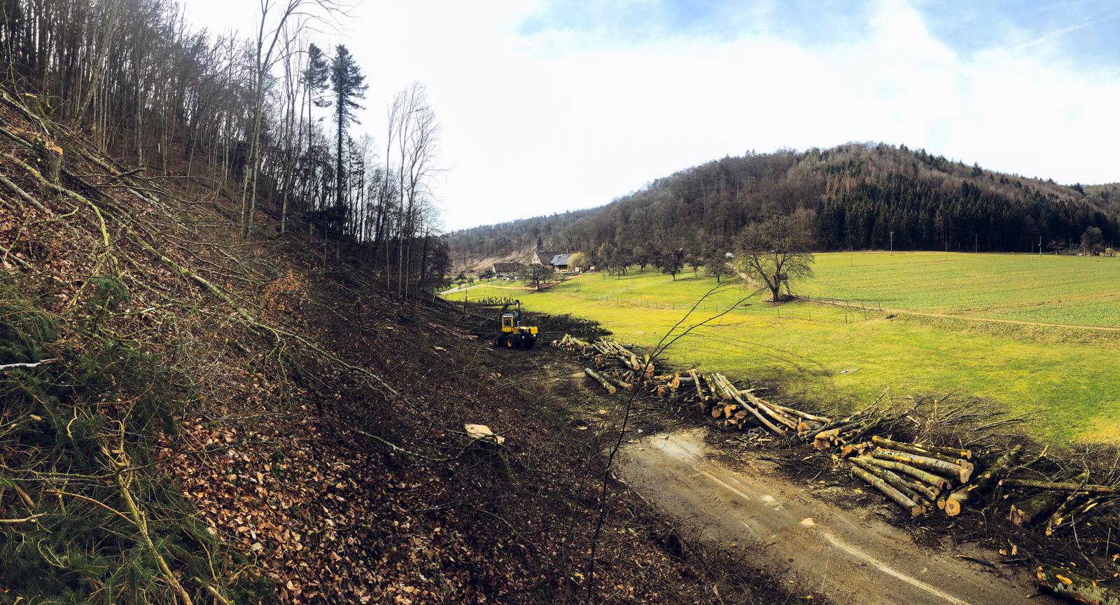 In Zusammenhang mit einer Steilhangdurchforstung welche wir mit unseren Harvester und Forwarder, mit Trationshilfswinde und unserem Rückeschlepper durchführen, konnten wir ebenfalls auch ein Stück des Schutzwaldes oberhalb von Stallikon pflegen.