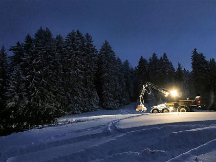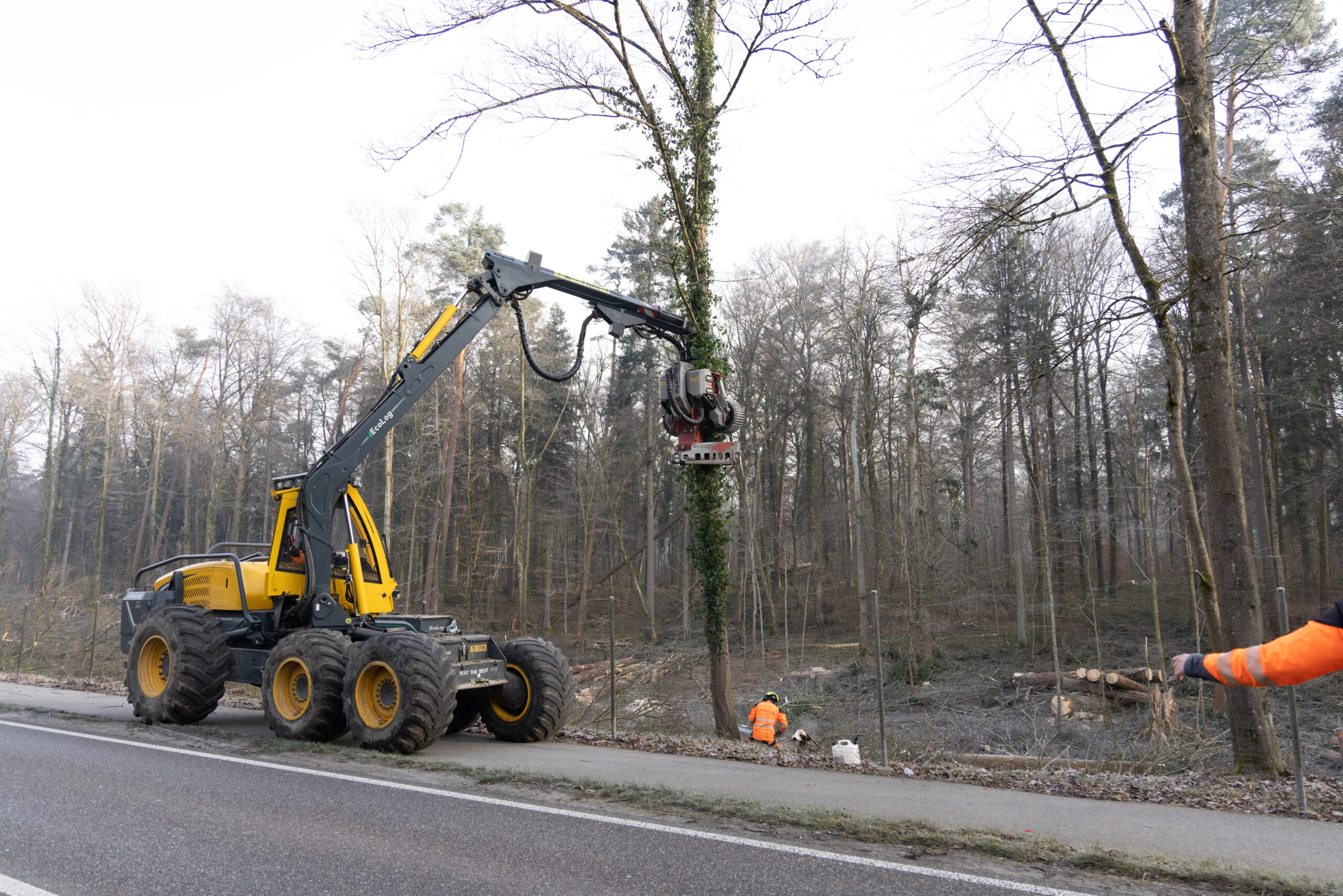 Wir durften oberhalb der Reppischtalstrasse entlang des Türlersees einen grossen Sicherheitsschlag ausführen. Während einer Woche war die Strasse für den Verkehr gesperrt. Sämtliches Holz im Strassenbereich konnten wir in dieser Zeit fällen, rüsten, rücken und einen Teil gleich hacken oder abtransportieren. Weiter entfernt stehende Bäume wurden in derselben Woche gefällt und vorgeliefert. In den folgenden Wochen wurden sie gerüstet und an die Strasse transportiert.