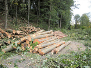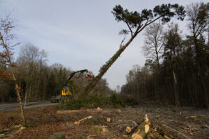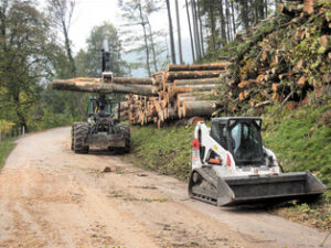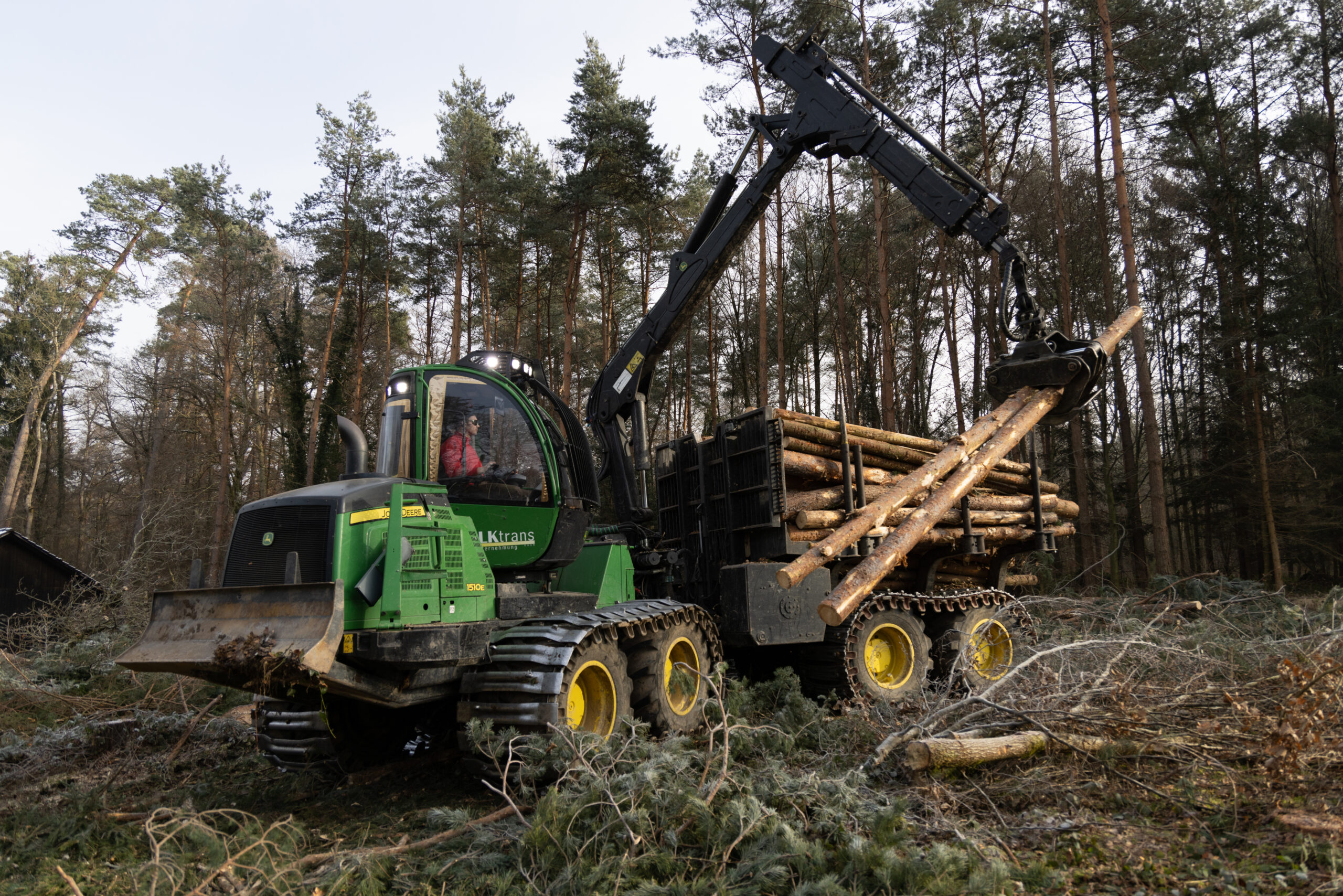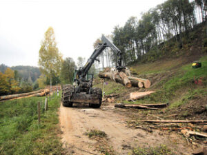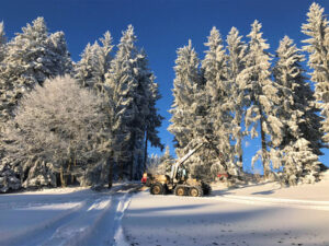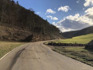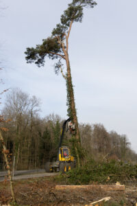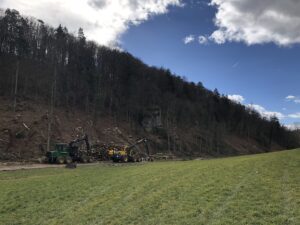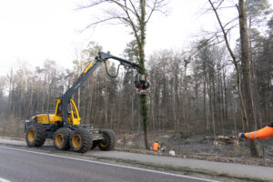 Durch eine vorherige Holzernte, außerhalb des Gefahrenbereiches der Straße, schufen wir Platz, um die Bäume im Straßenbereich an nur einem Wochenende während einer Vollsperrung zu fällen. Das gefällte Holz wurde direkt in die Fläche gerüstet und konnte somit später, ohne weitere Straßensperrungen, abtransportiert werden. Für diesen Einsatz nutzten wir den EcoLog 590E, den EcoLog 560F sowie den John Deere 1510E.