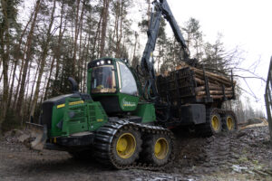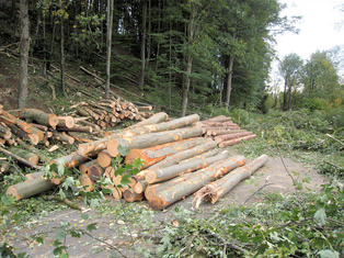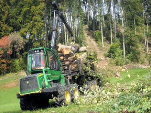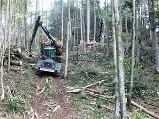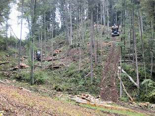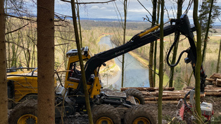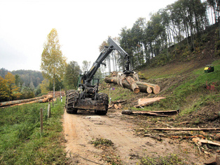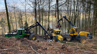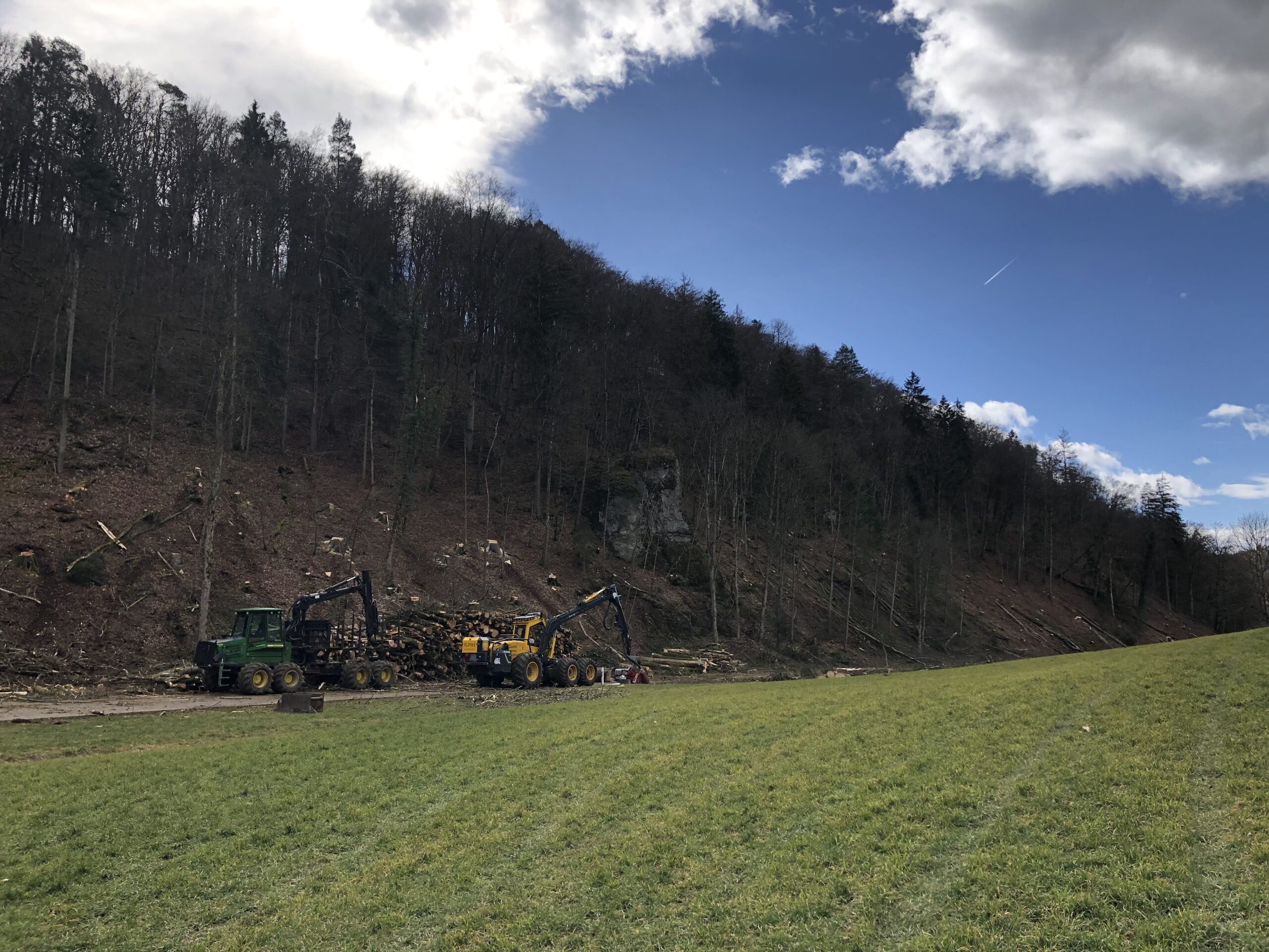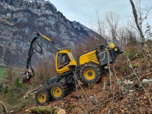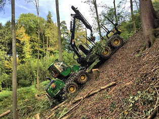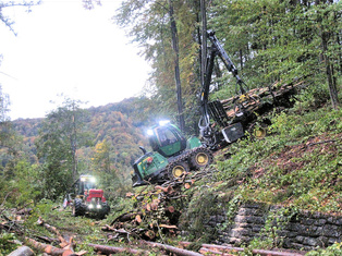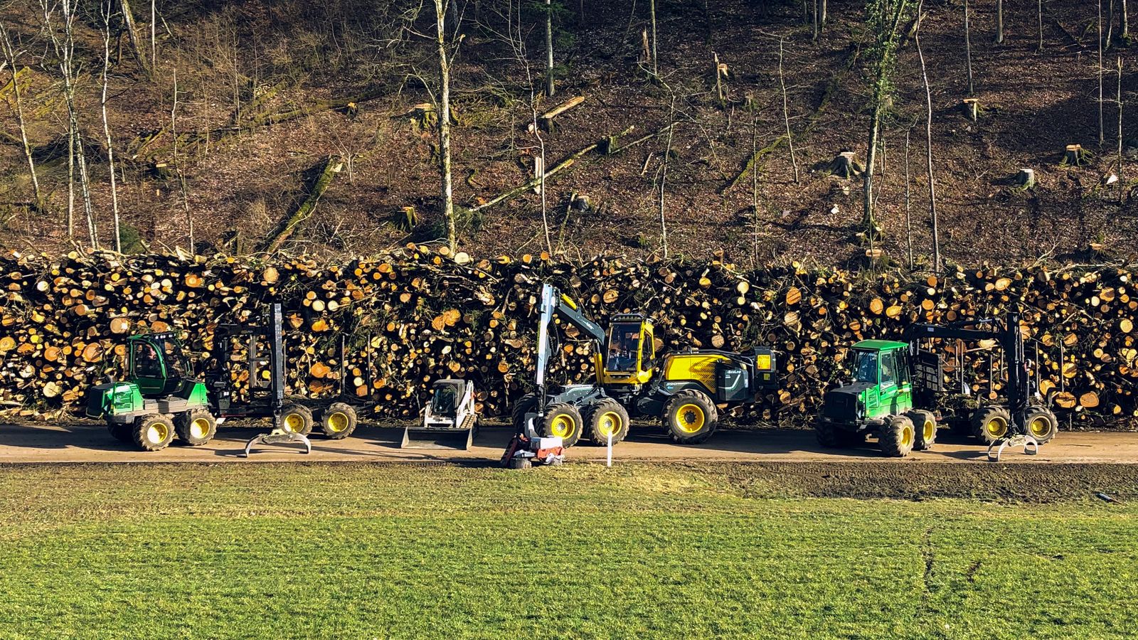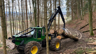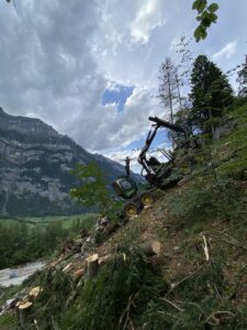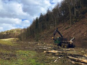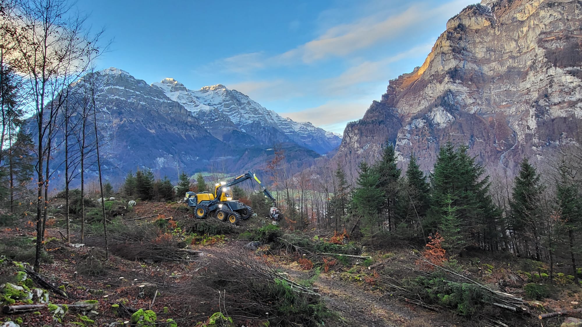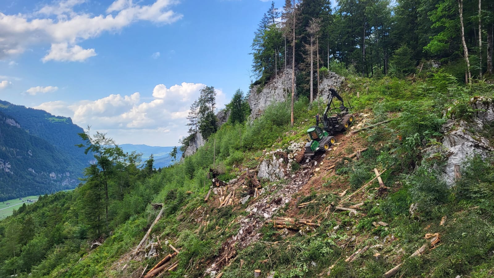 Die Herausforderung dabei war das felsige und steile Gelände. Wir haben die Bäume mit dem EcoLog 590E, ausgestattet mit einer Traktionswinde, gerüstet und mit dem John Deere 1510E mit interner Traktionswinde gerückt. Anschließend konnte von der Kalkfabrik Netstal AG ein Zufahrtsweg für ihre Maschinen in den Berg gelegt werden.