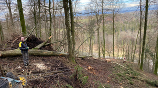 Ein grosser Teil des Holzes konnte nach unten auf die Kantonsstrasse gefällt werden. Im oberen Teil mussten die Bäume mit der Seilwinde an die Waldstrasse vorgeliefert werden. Am meisten Zeit benötigen immer die Aufräumarbeiten nach der Holzernte.